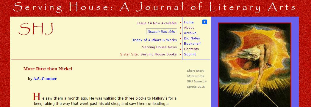 My short story, More Rust than Nickel, is out now in Issue 14 of Serving House Journal.