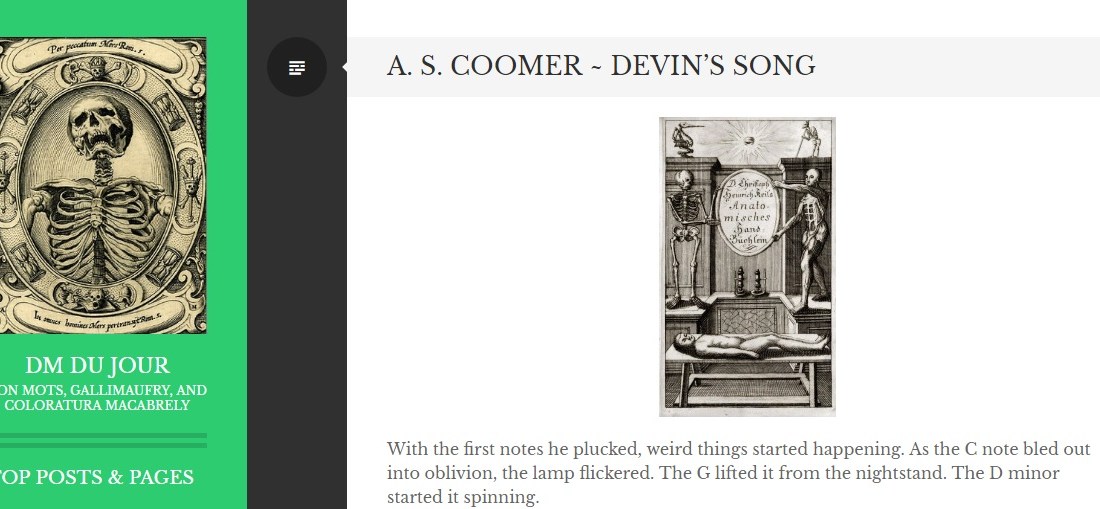 If you want to start your day off on a strange note (because who doesn’t?), I’ve got a weird little story up now at Danse Macabre’s daily gazette DM du Jour called: Devin’s Song. It’s about a little boy with a musical ability unlike any the world has ever seen. Give it a read. Let me know what you think.