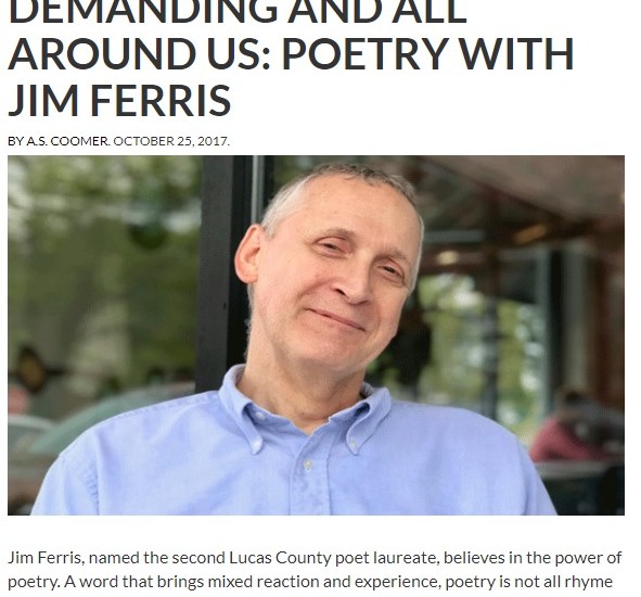 I got to pick Jim Ferris‘ brain about poetry. He’s Lucas County’s second (ever) poet laureate and The Ability Center Endowed Chair in Disability Studies at the University of Toledo. It was a lively and entertaining discussion and only a fraction of it made it into an article I wrote for The City Paper.