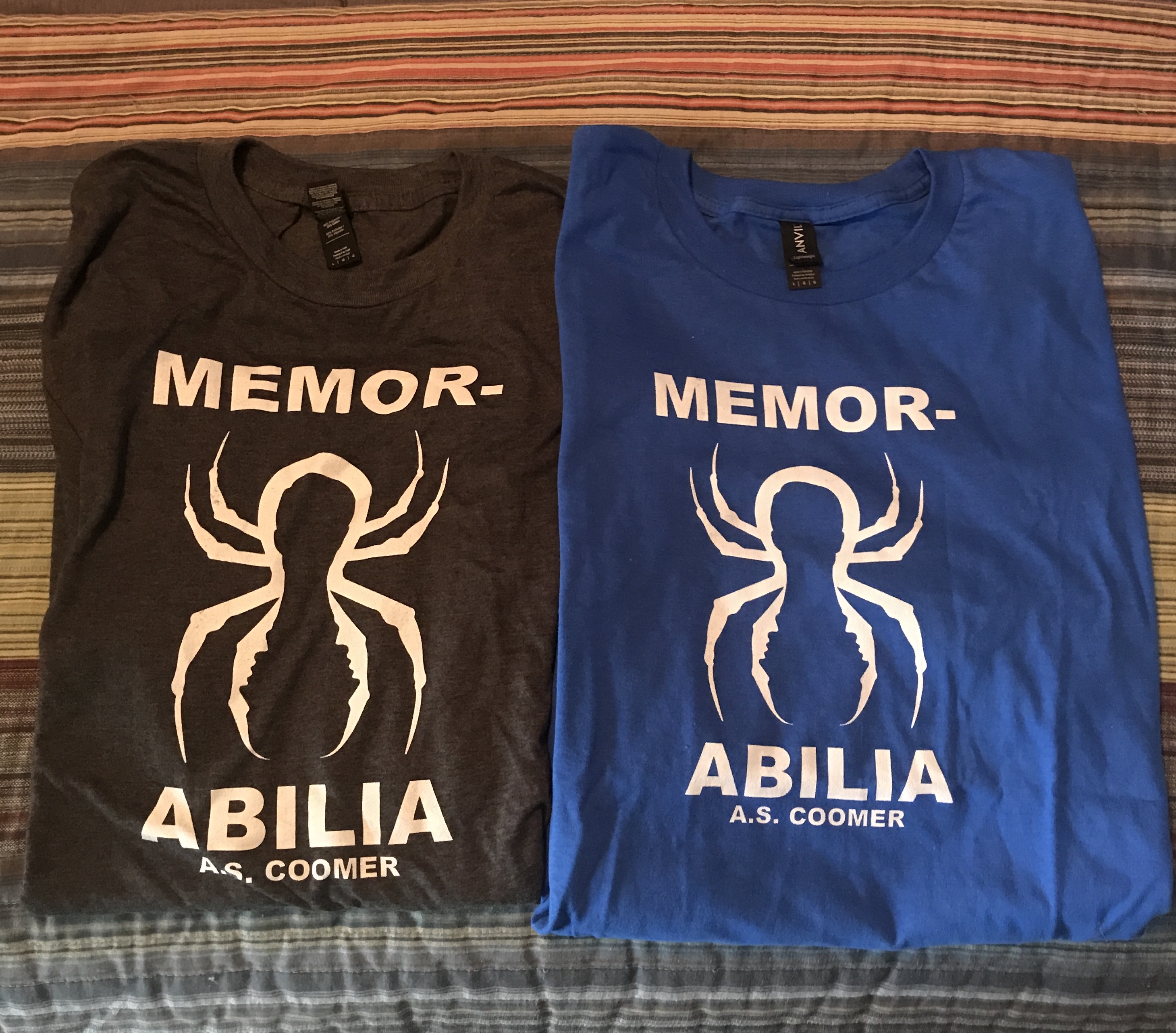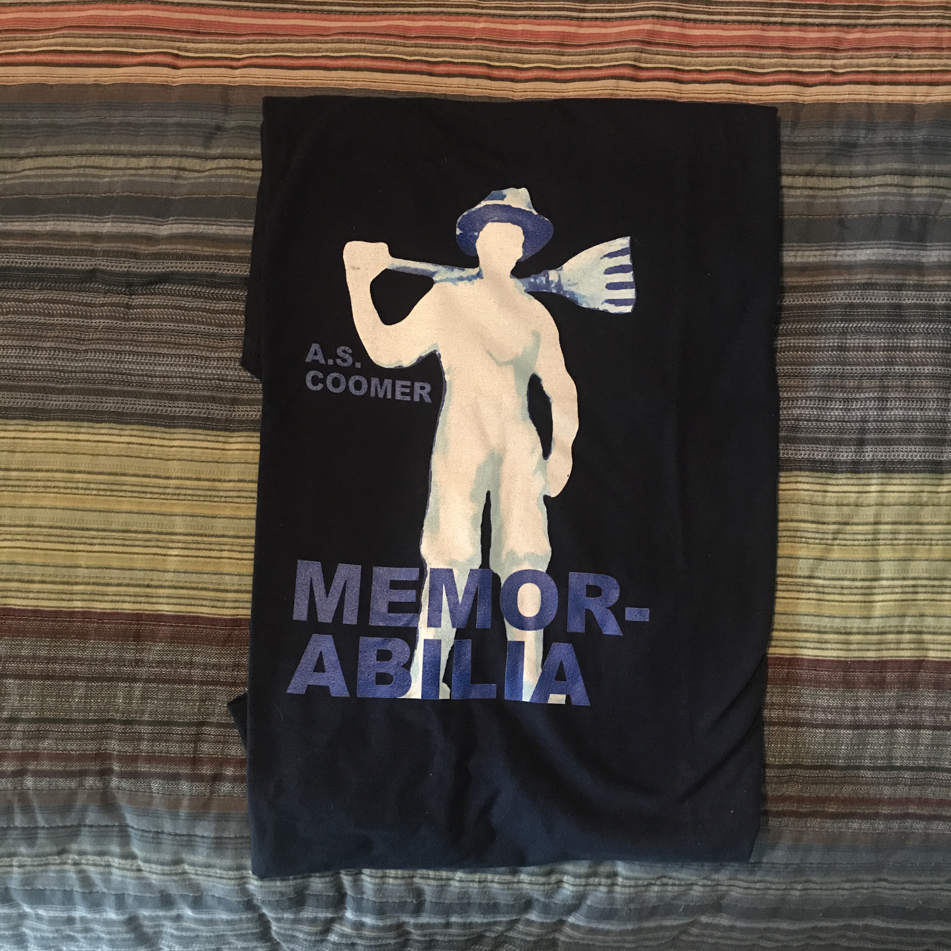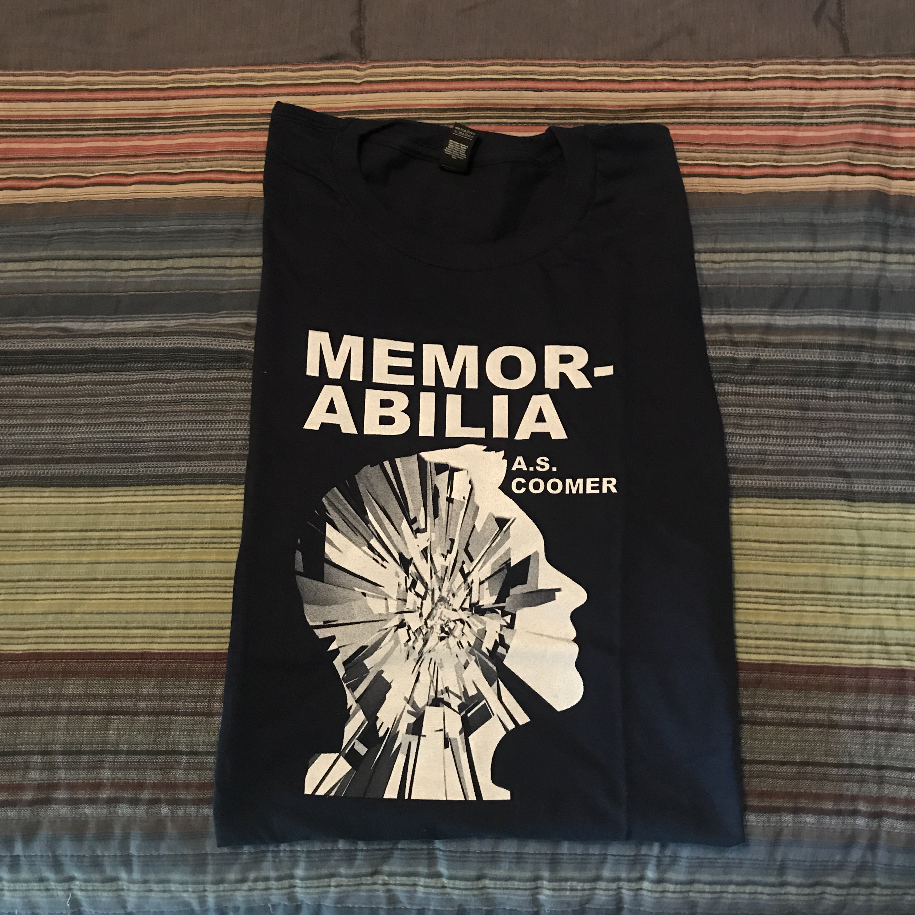 A.S. Coomer’s fifth novel, Memorabilia, has developed its own memorabilia: a boxful of T-shirts. 100% Cotton, Anvil Lightweight shirt. Specify your size in the notes/comments. Sizes available: Large, Medium, and Small* *limited quantity, while supplies last Only one size Small left.