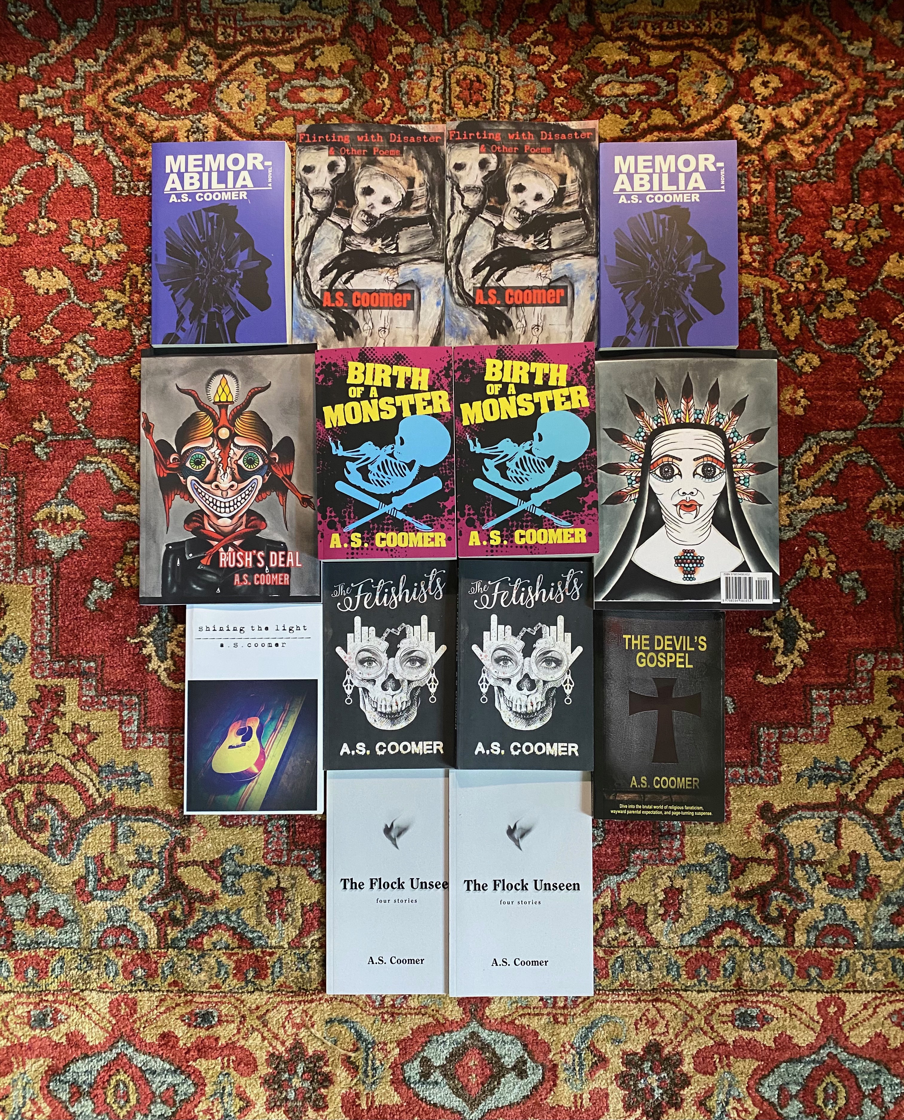 I got some more books in stock. I’ve got limited-edition paperbacks of Memorabilia, Birth of a Monster, Rush’s Deal, The Flock Unseen, The Devil’s Gospel, Flirting with Disaster & Other Poems, and one last copy of Shining the Light.