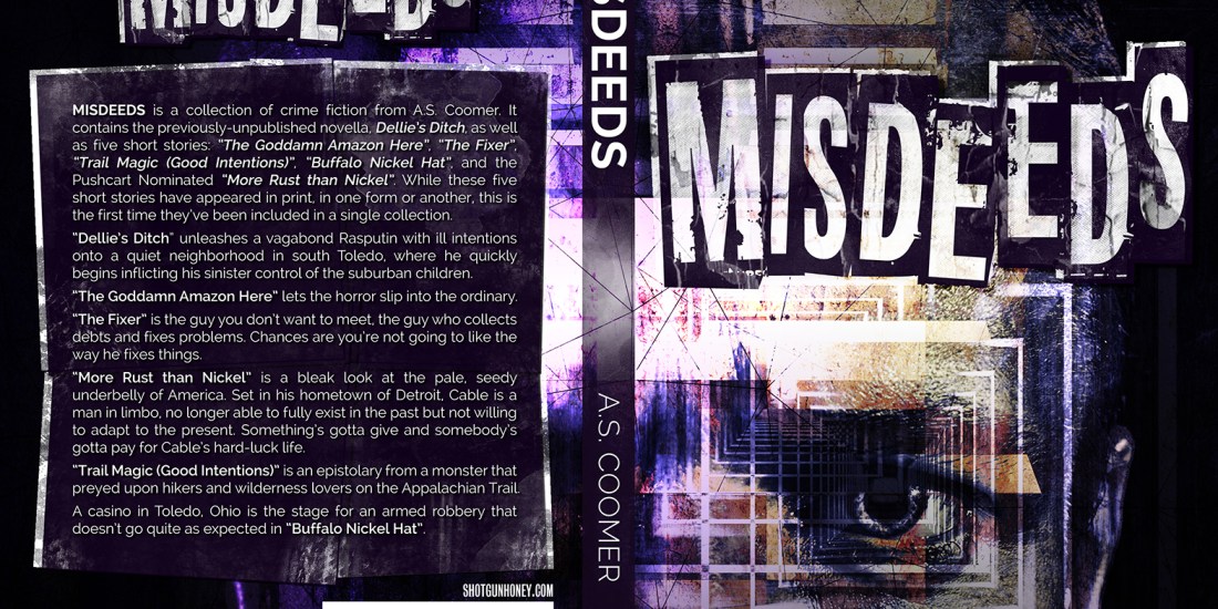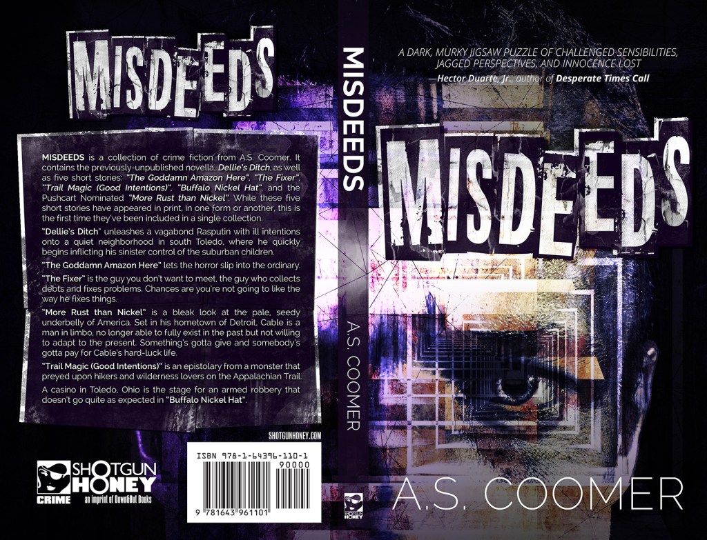 Misdeeds is a collection of crime fiction from A.S. Coomer. It contains the previously-unpublished novella, Dellie’s Ditch, as well as five short stories: The Goddamn Amazon Here, The Fixer, Trail Magic (Good Intentions), Buffalo Nickel Hat, and the Pushcart Nominated More Rust than Nickel. While these five short stories have appeared in print, in one form or another, this is the first time they’ve been included in a single collection.