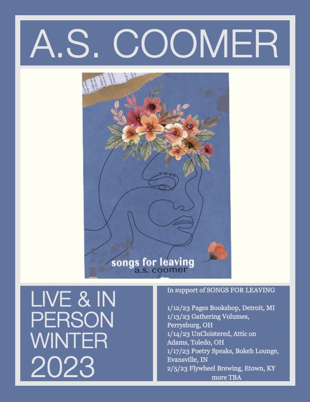“A.S. Coomer’s poems trace the “receding stygian tide kept barely at bay,” but he’s not in the business of delineating spiritual doom and lived experience. This poetry seeks to invent new phrasings that we might utter or listen to as we “count the hours by the silt rings.” “Despite it all: / make, do, see / if you’re able” Coomer implores us. These Songs For Leaving are outboard lyrics engineered to propel us around liminal island, “greasy hullaballoos… electric fangs rending neon flesh.” I know Coomer’s readers will find this chapbook a welcome addition to his polymathic catalogue. It’s hard not to fall in.”