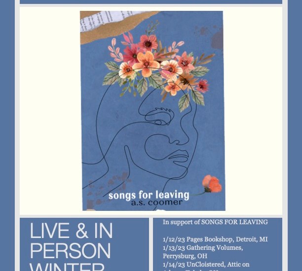 Songs for Leaving is the latest collection of poems from prolific writer and musician A.S. Coomer. “Be the damn after every God,” he advises, “. . . make a big stink.” Lots of great verbal pictography here, each piece distilled and presented in exact, precise language. Growing gardens of hope in the heart, and where else can we grow, after all, ache like bulb near bloom, hollowed out by a deeper need? With night blues looming over it all, as the televised sky screams the screech of bombs, as we viewers feign calm, numbed by numberless views of the same unfeeling broadcast, beholden to the lows by our spectation through thin hard glass walls of screens on our phones and computers, miles and miles of wires between us and the action, & here come the End Times, fa la la.