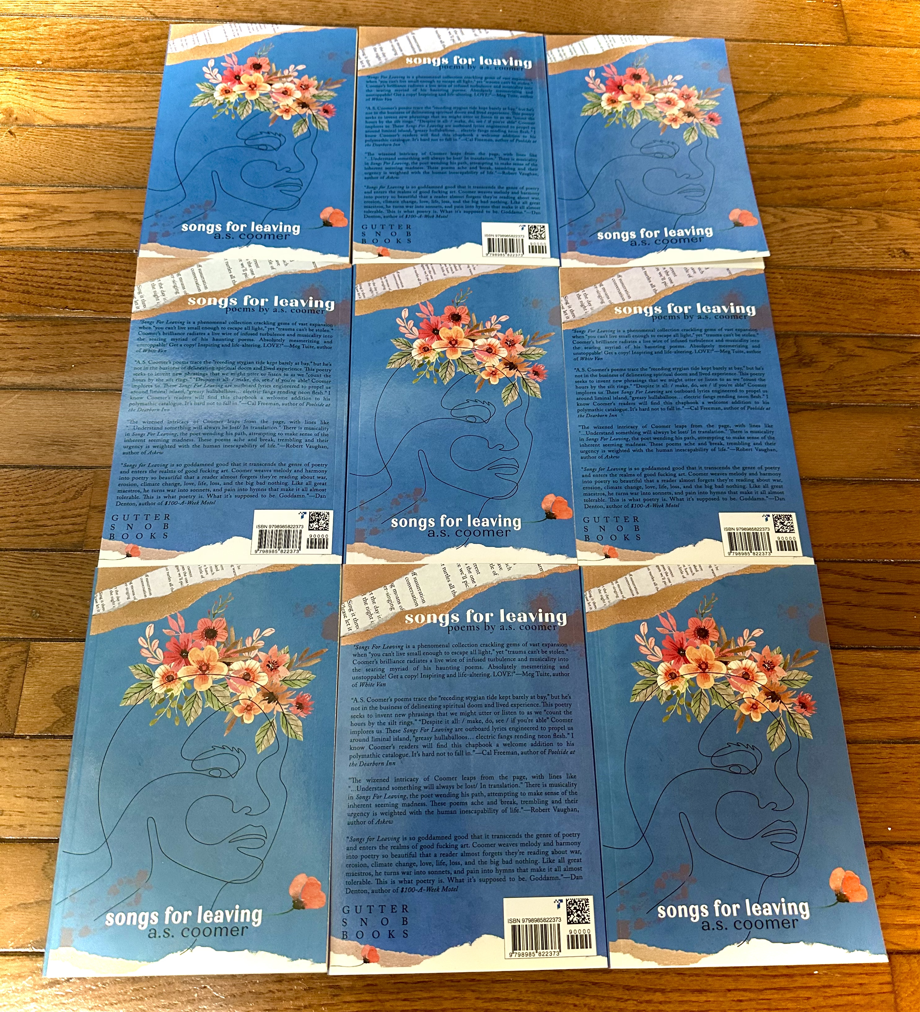 SONGS FOR LEAVING (Gutter Snob Books) is out. I’m gonna hit the road to do a little book peddling & poetry reading. Might sling a song or two, who knows.