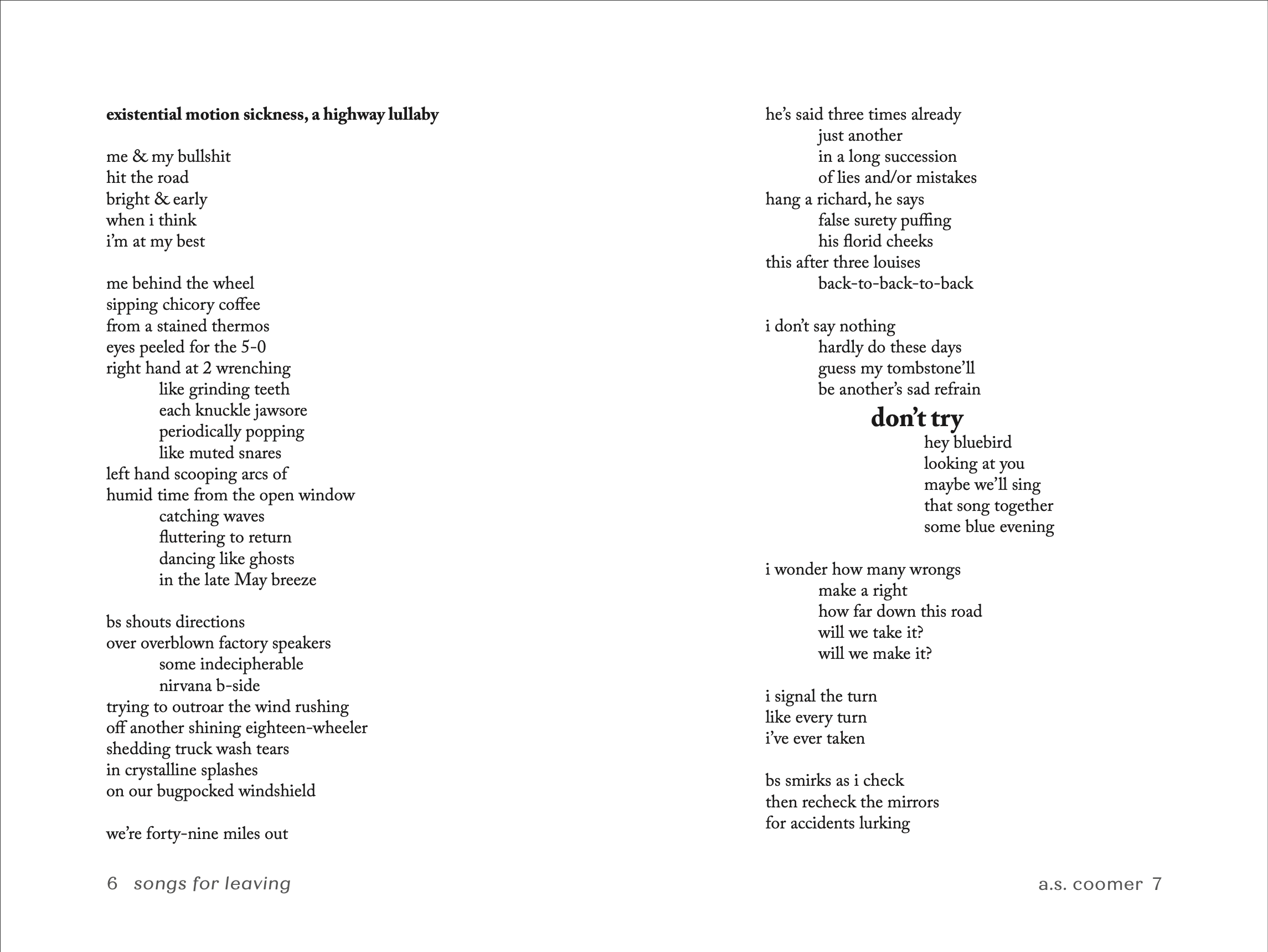 This poem, existential motion sickness, a highway lullaby, is included in my Gutter Snob Books poetry collection SONGS FOR LEAVING, which is out now.