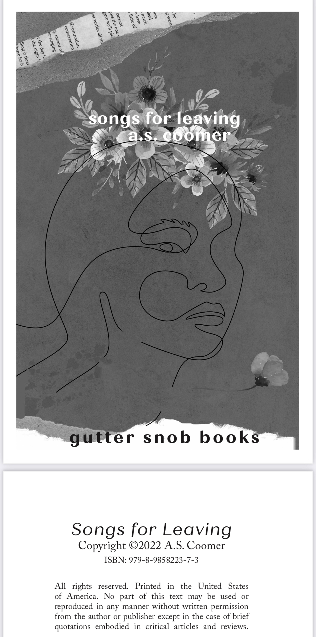 $15 gets you a signed paperback copy of A.S. Coomer’s 2022 Gutter Snob Books poetry collection SONGS FOR LEAVING shipped to yer door (USA ONLY–overseas peeps shoot me a message).