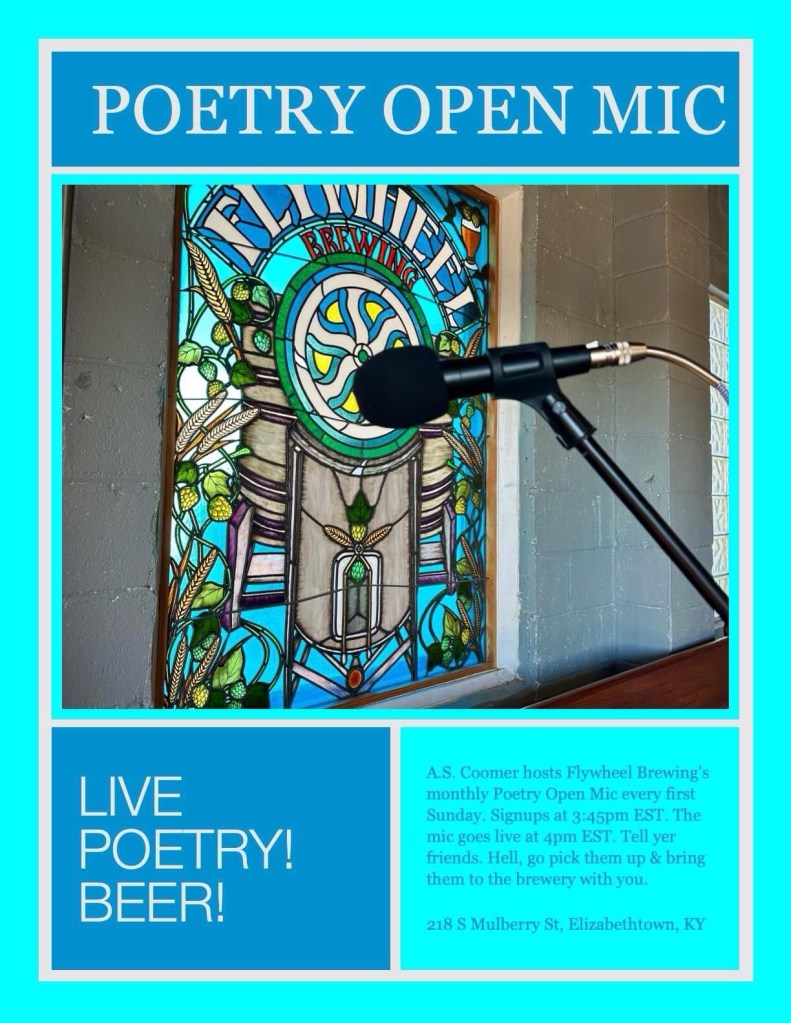 I’m kicking things off in dear old Elizabethtown, KY hosting Flywheel Brewing’s POETRY Open Mic on 6/2/24. I host this every first Sunday at 4pm EST.