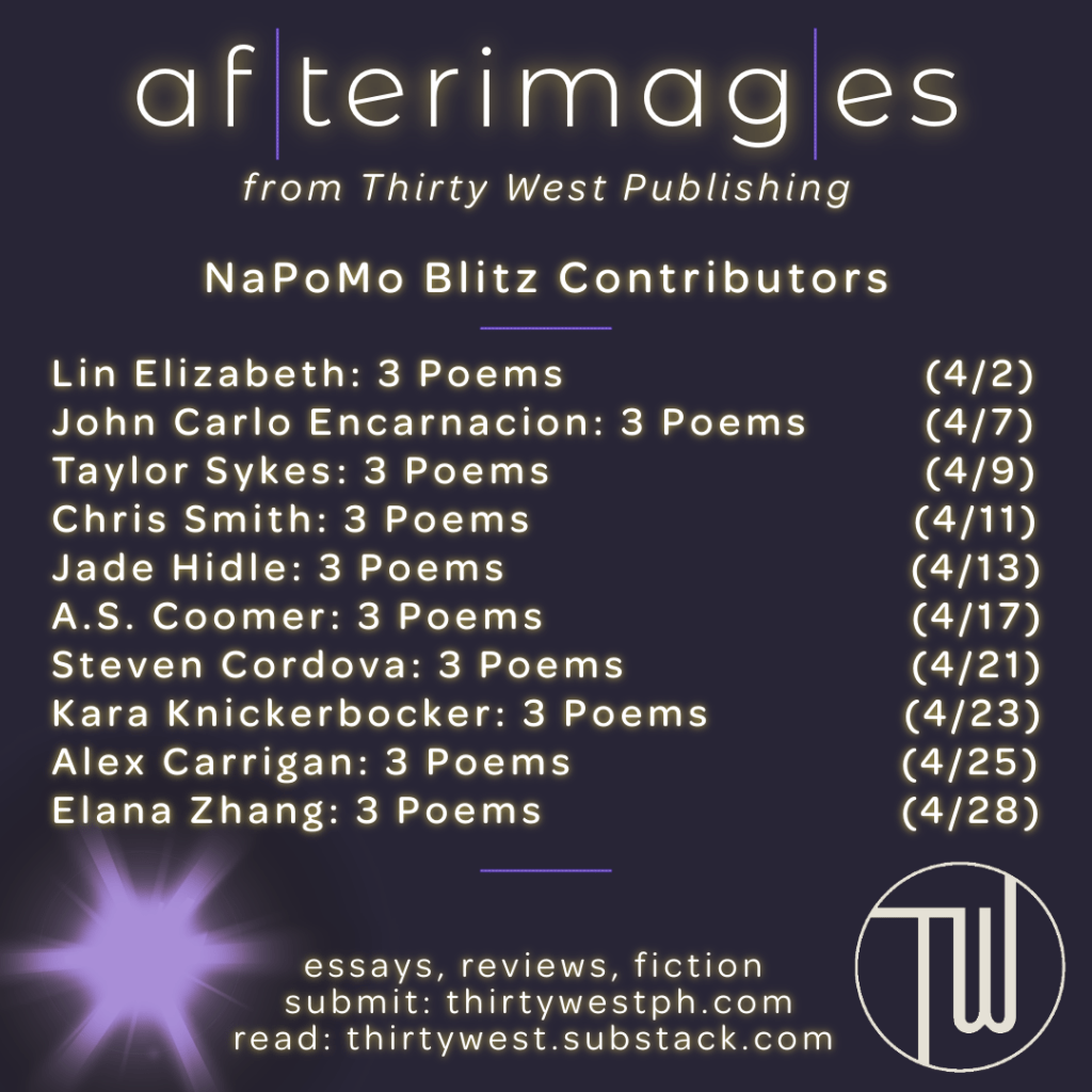 the good folks at Thirty West Publishing House published three of my compressed syllabic sonnets in their literary baby Afterimages this afternoon. you can read the Poems on their substack. or you can signup for their email newsletter to start receiving all things lit.