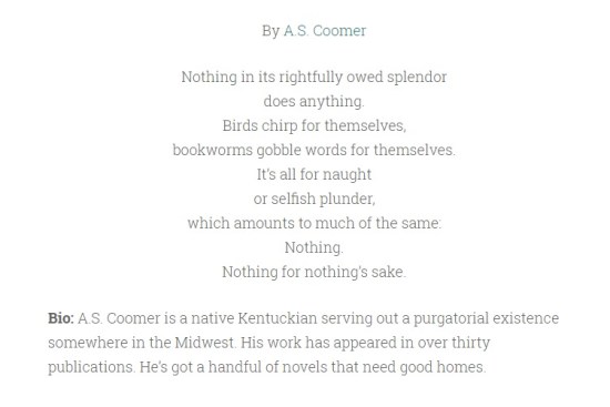 Evening, Nothing, a short poem of mine, is out now in The Drabble. Check it out here. -A.S. Coomer